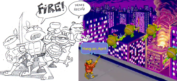 La primera pantalla es una tremenda orgía de caos con las tortugas y los miembros del clan del pié (terrorífica imagen se me ha venido a la mente con eso de «orgía») en la que tendremos que empezar a machacar botones ya desde un principio para sacarnos de encima a esos cabrones de púrpura, azul, rojo y blanco (ni puñetera idea de esta nueva explosión de colores entre las filas de los ninjas, lo cierto es que estos colores no son precisamente los más adecuados para ocultarte o pasar desapercibido). Curiosamente, la prioridad inicial de las tortugas es llegar al bloque donde vive April para salvarla (o vete tú a saber). Esto me escama. ¿No habrá acaso más personas en ese edificio en llamas? Tengo dos teorías: una, que todos estuviesen de vacaciones en ese preciso momento menos April, que es una maldita sosa trabajadora pelotillera; o dos, que TODOS sus vecinos fuesen miembros del clan del pié, que no se hubiesen revelado hasta ese mismo momento (menudo trauma, ¿te imaginas que tu vecina regordeta, la del perrito meón, resultara ser un ninja asesino? ¿Y su perro también? ¿y que quisiera matarte? ¿te horrorizaría o lo verías lógico?). Porque la tercera opción sería que las tortugas ninja son unas putas cabronas, pero todos sabemos que eso no es así, ¿verdad? ¿VERDAD?
